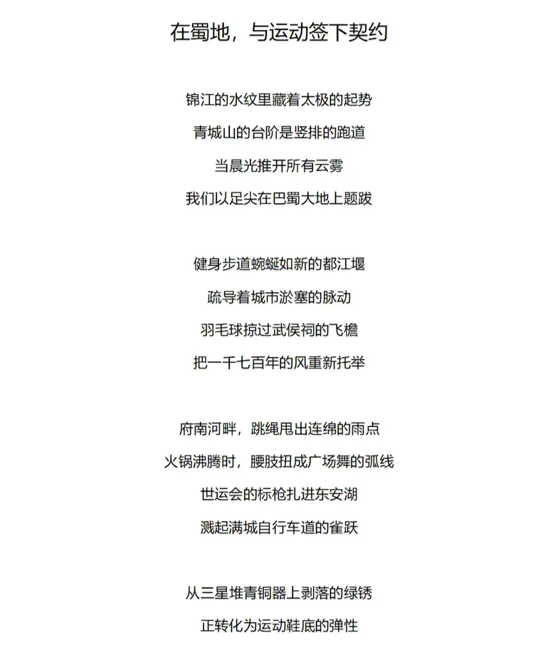 由四川省体育局主办,四川省体育博物馆承办,四川日报联合推出的2025年四川省“我的健身故事”全民健身有奖征集活动圆满结束,本次活动以“与世运同心,与全运同行”为主题,通过多样化的形式讲述全民健身故事,生动展现四川人民积极向上、奋勇拼搏的精神风貌,并创新征集模式,采用“社会+校园”双轨征集,参赛类别首次扩展至文学、书画、摄影、短视频、体艺类等五大板块。现将优秀作品进行展示,供广大读者欣赏。